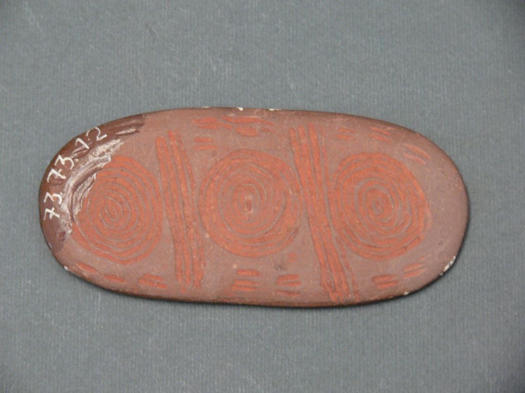Lapos, ovális kő, mindkét oldalán karcolt geometrikus díszítéssel. Vöröses színűre festett.