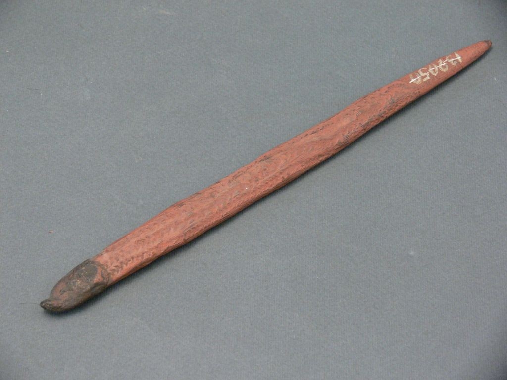 Színezett, kihegyezett végű lapos pálcika, másik végén gyanta. Karcolt díszítéssel.