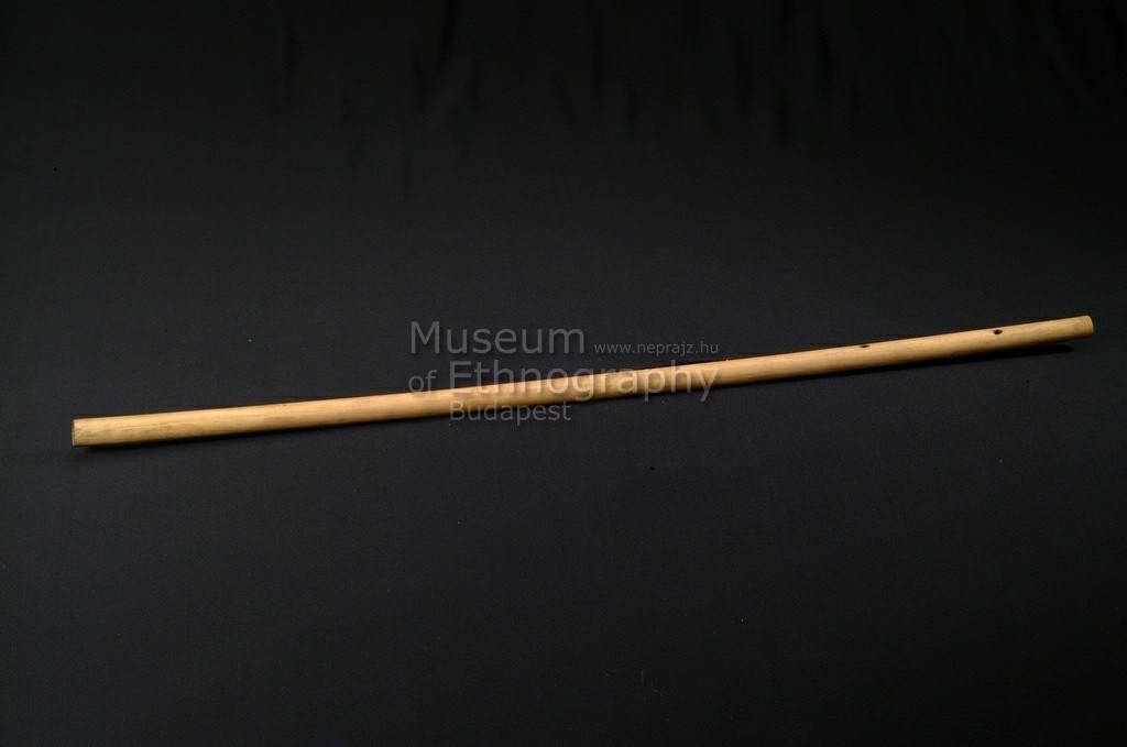 Vékony, hengeres, sárgás-színű nád cső. Egyik végén a nóduszból kialakított keskenyebb nyílással. Ehhez közel két, égetett szélű lyukkal. Egyik végén több repedéssel.