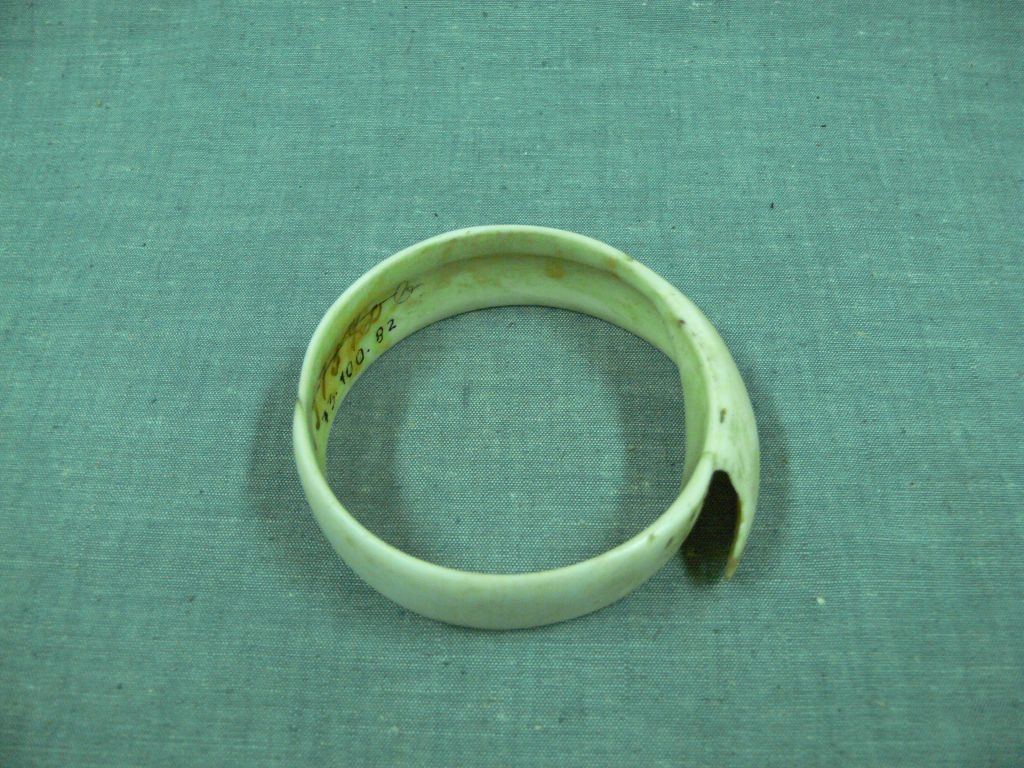 Egy darab kagylóból készített hengeres karperec, a kagyló legalsó részé van levágva ehhez. Egyik pontján a vége ráhajlik .
