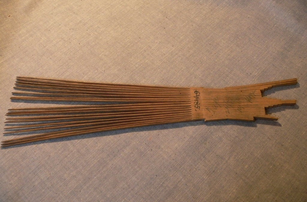 Hosszúkás, középen elkeskenyedő, lapos, fából készült tárgy. Egyik oldalán 4/5-öd részben a fésű fogai vannak kifaragva, felső, fogórészén a falap egyben van, tetején három csúcsban kifaragva, ami leginkább egy koronára emlékeztet. Az egyik ilyen végzödés törött.