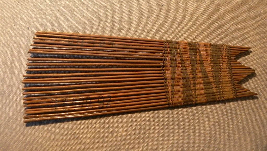 Hosszúkás, téglalap alakú tárgy, fapálcikákból összekötözve. Felső végén 1/3-ad részben, széles sávban fehér és fekete növényi rosttal van összekötözve. Alsó részén a szétnyitott pálcák képezik a fésű fogait.