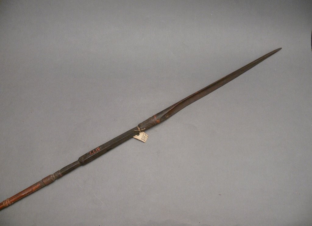 Háromrészes nyílvessző. A bambuszból metszett szárba növényi rostfonattal rögzítették a fából faragott, négyzetes keresztmetszetű középrészt, ahhoz pedig ugyanilyen technikával a bambuszból hasított hegyet.