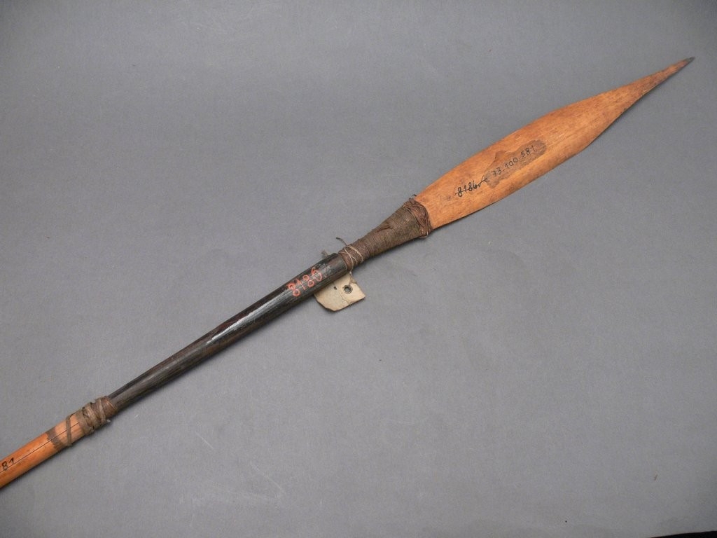 Háromrészes nyílvessző. A bambuszból metszett szárba növényi rosttal rögzítették a fából faragott, kerek keresztmetszetű középrészt, ahhoz pedig ugyancsak növényi rostból készült zsineggel kötözték hozzá a levélalakú bambuszhegyet.