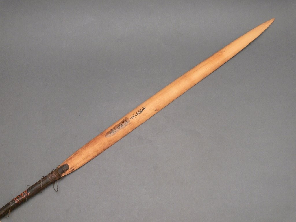 Háromrészes nyílvessző. A bambuszból metszett szárba növényi rosttal rögzítették a fából faragott, kerek keresztmetszetű középrészt, ahhoz pedig ugyancsak növényi rostból készült zsineggel kötözték hozzá a levélalakú bambuszhegyet. A hegy belső oldalán fekete festett sáv húzódik végig.