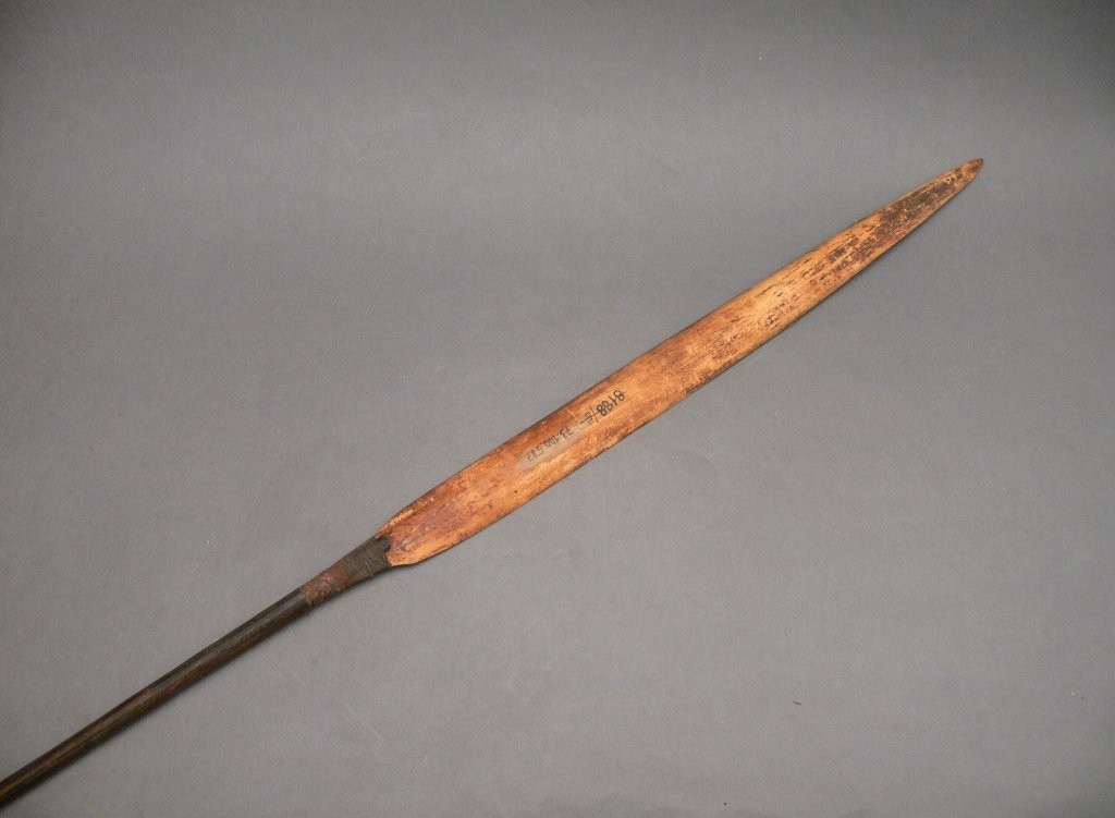 Háromrészes nyílvessző. A bambuszból metszett szárba növényi rosttal rögzítették a fából faragott, kerek keresztmetszetű középrészt, ahhoz pedig ugyancsak növényi rostból készült zsineggel kötözték hozzá a levélalakú bambuszhegyet. A hegy belső oldalán fekete festett sáv húzódik végig.