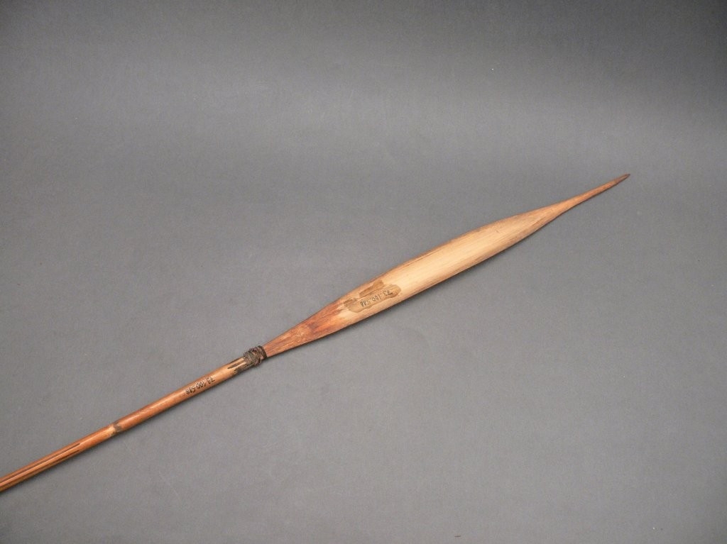 Kétrészes nyílvessző. A bambuszból metszett szárhoz ugyanilyen anyagból faragott levélalakú hegyet rögzítettek. A szárat hosszában futó égetett csíkokkal díszítették.