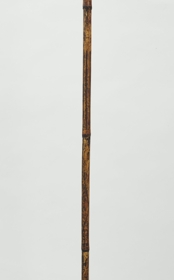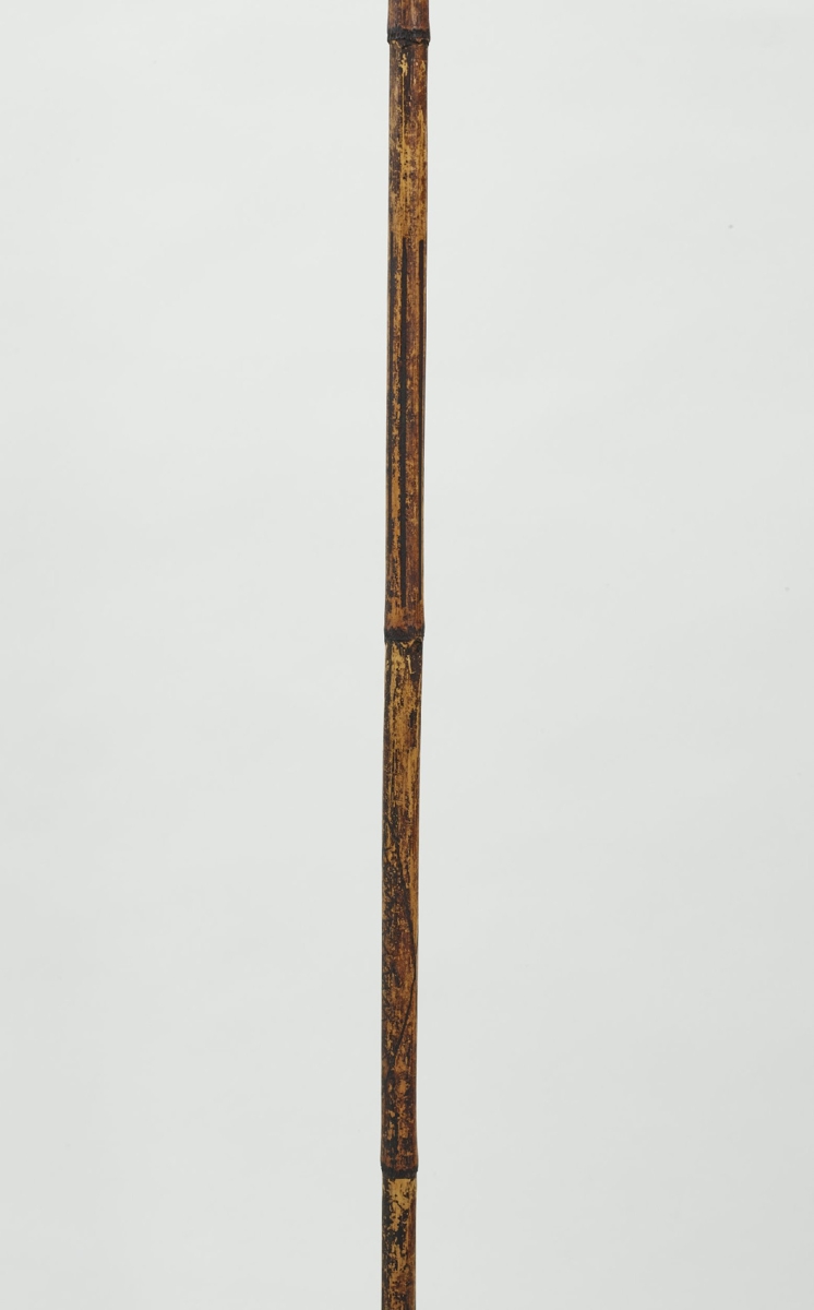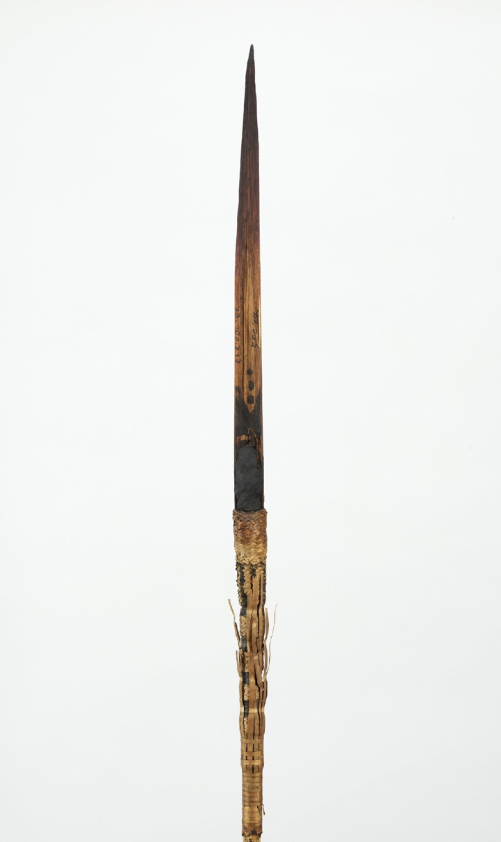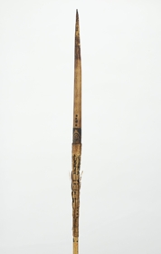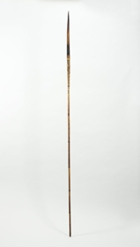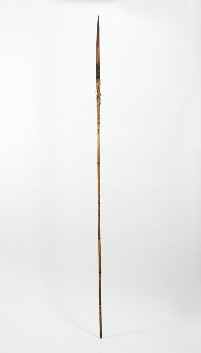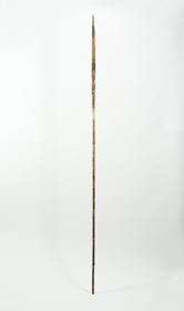 Bambusz nyelű és hegyű nyílvessző. Szélesebb levél szerű hegyén fekete geometrikus motívumok díszítik. A két rész találkozásánál növényi fonat fogja össze.
