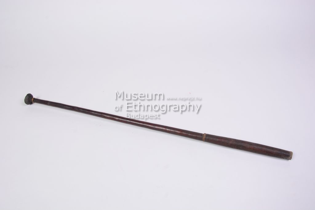 Sötétbarna keményfából készült, széle enyhén szabálytalan keresztmetszetű, megközelítőleg egyenes. Oldalai egyhén domborúak. A markolat mindkét végén 5,8 mm széles gyűrű volt. A markolat felületén, és a markolaton túl még kb. 70 mm hosszan, egymással szemben két, keskeny, alacsony hosszanti gerinc fut végig. Az ovális alakú ütőfej töredékes, gömbszelet alakú, teteje egyenes, rajta vésett díszítés. Az egyik körfelező egyenes egy keskeny, két oldalról árkolt gerinccel kiemelt. A hét 'orsószerű' (növényi levél, virágszirom?) alakzatból álló fő motívum erre a körfelező egyenesre szimmetrikus. Az 'orsószerű' alakzatok közötti felület vésett vonalakkal díszített. PA