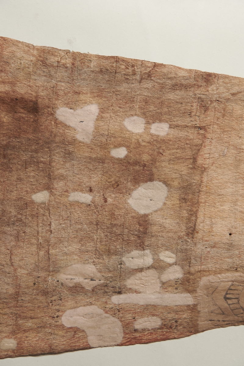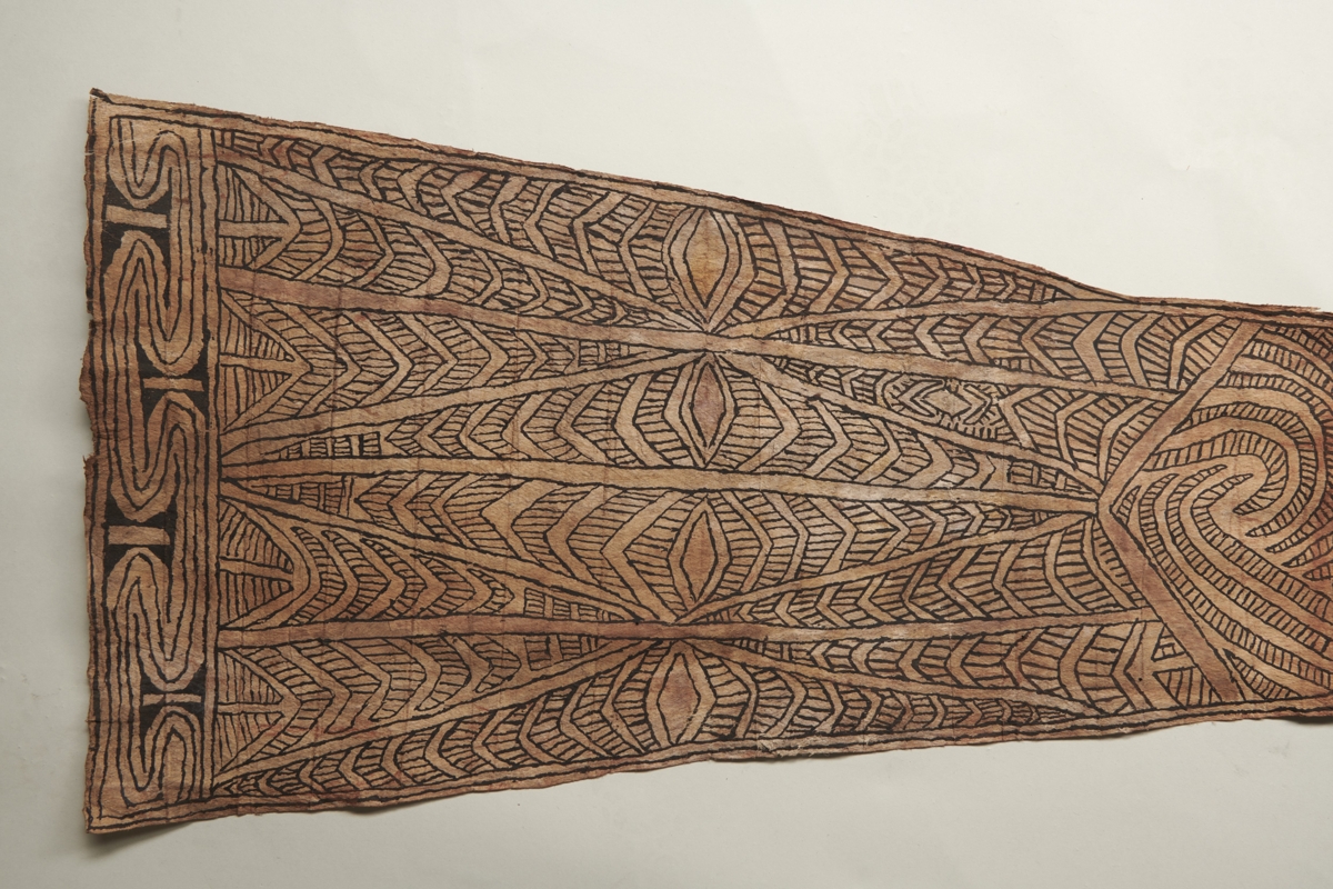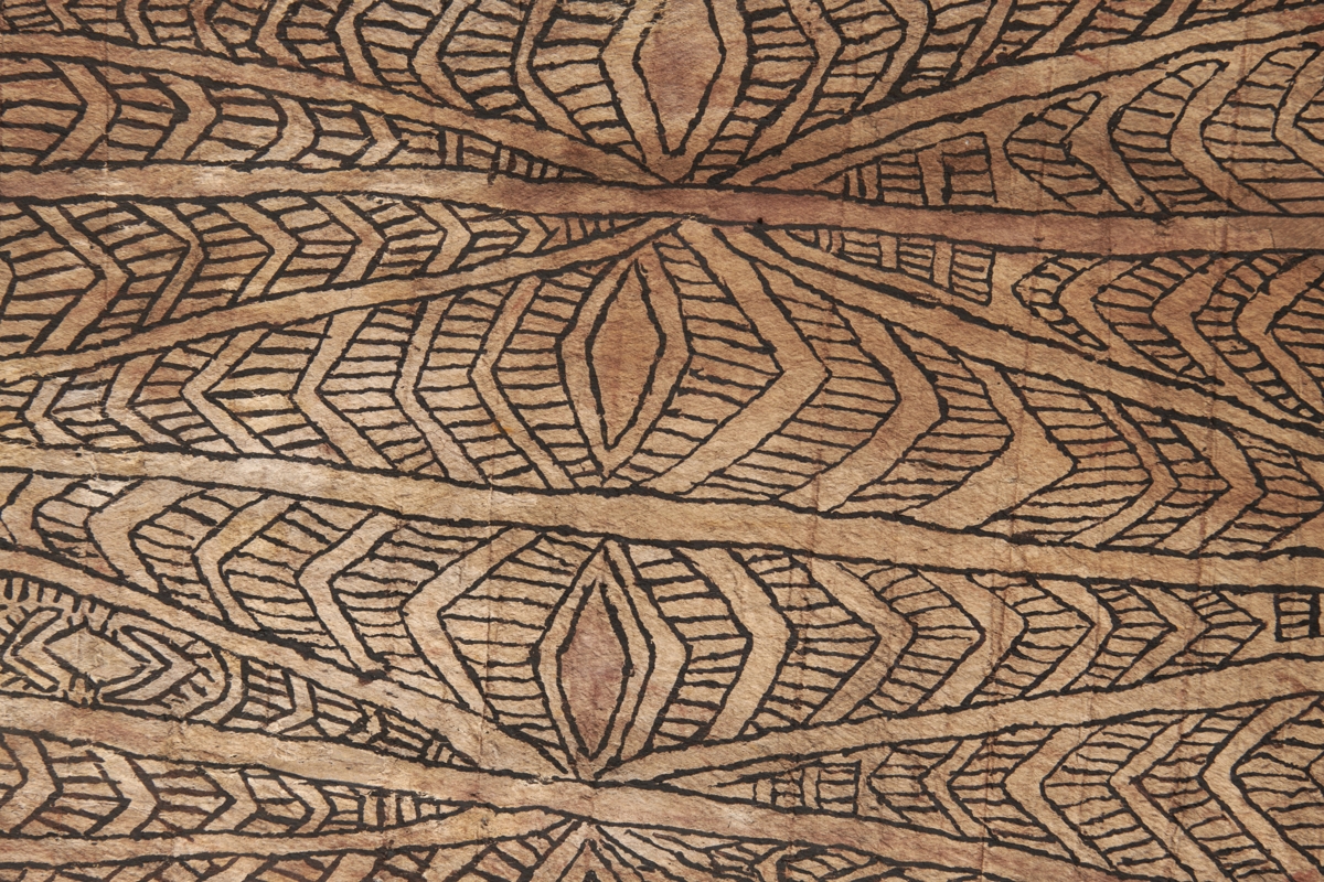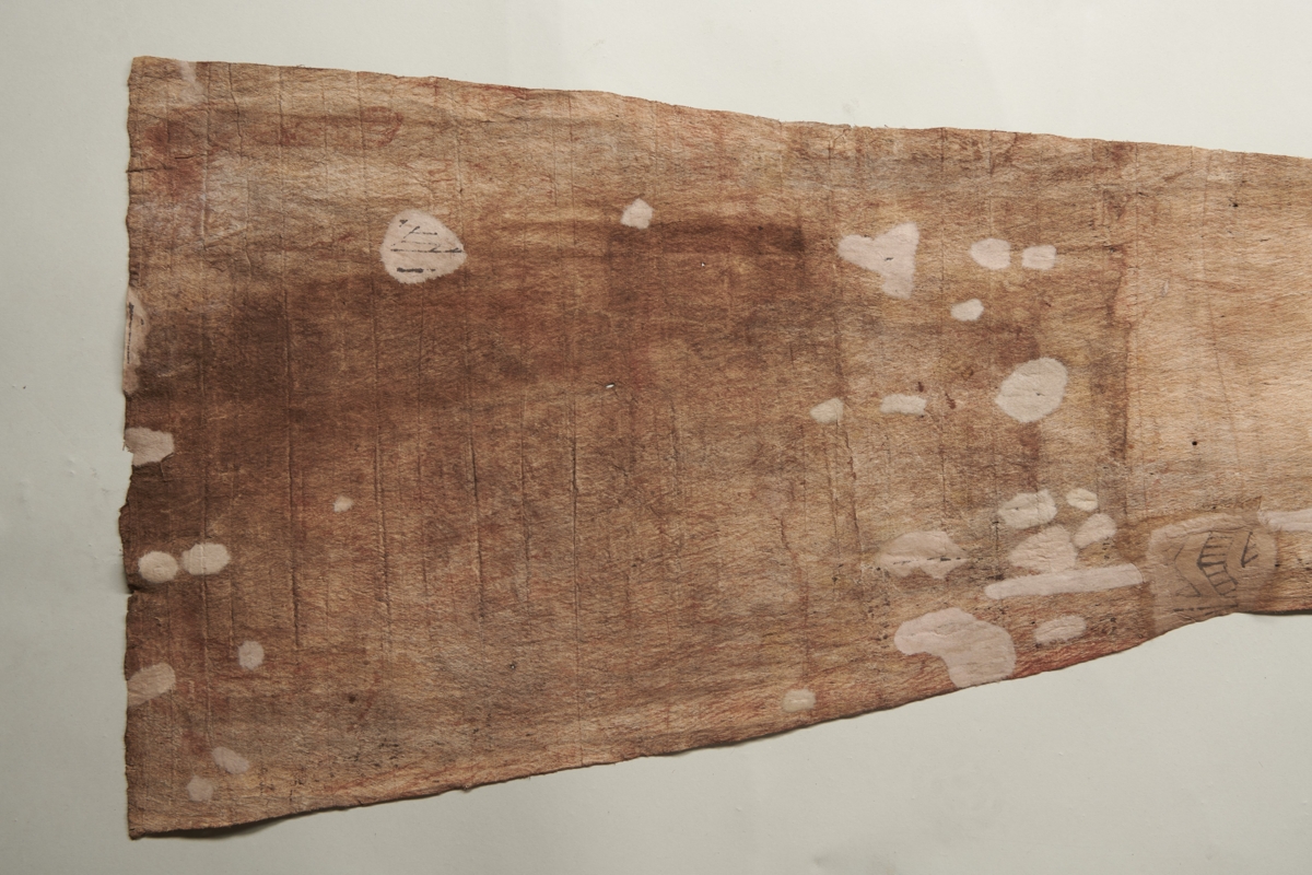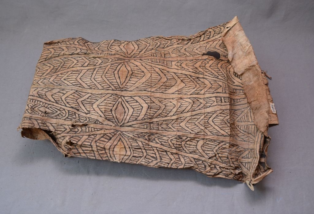 Hosszúkás, világos színű, fekete és vörös geometrikus mintákkal díszített kéregtextil.