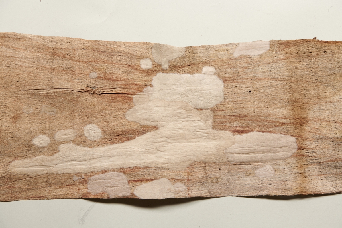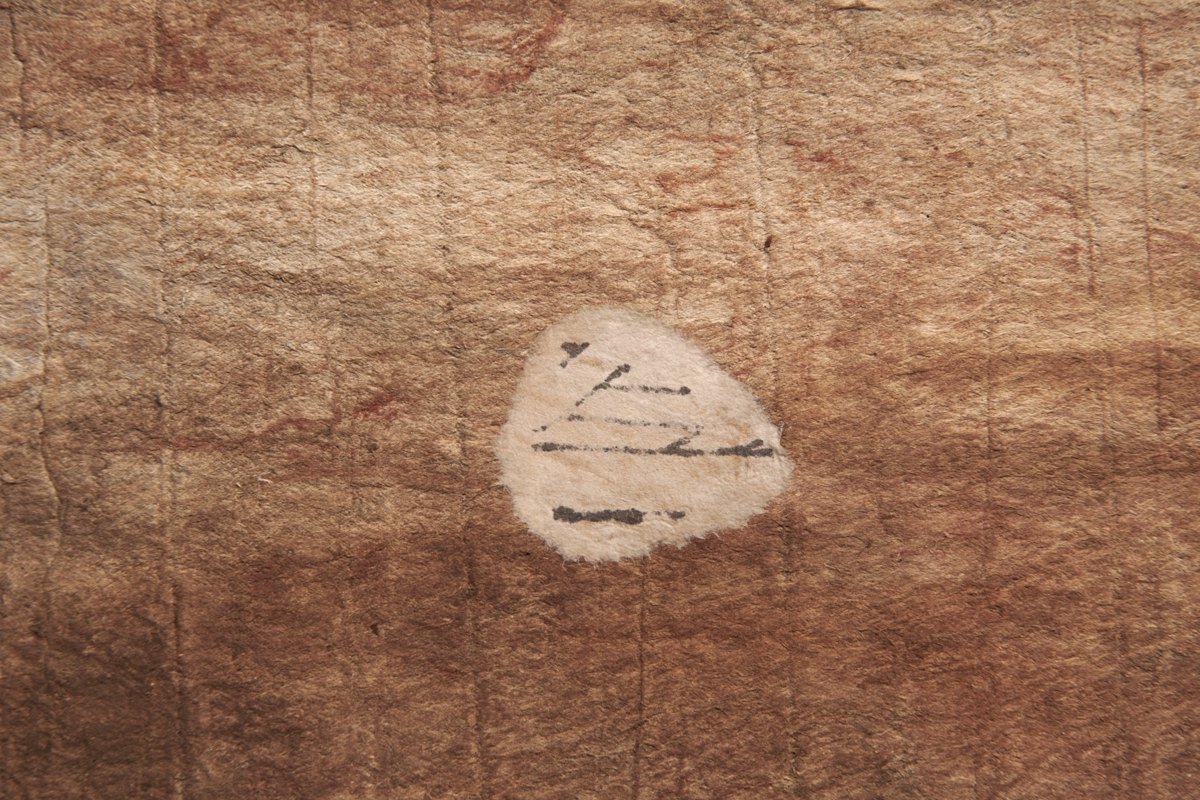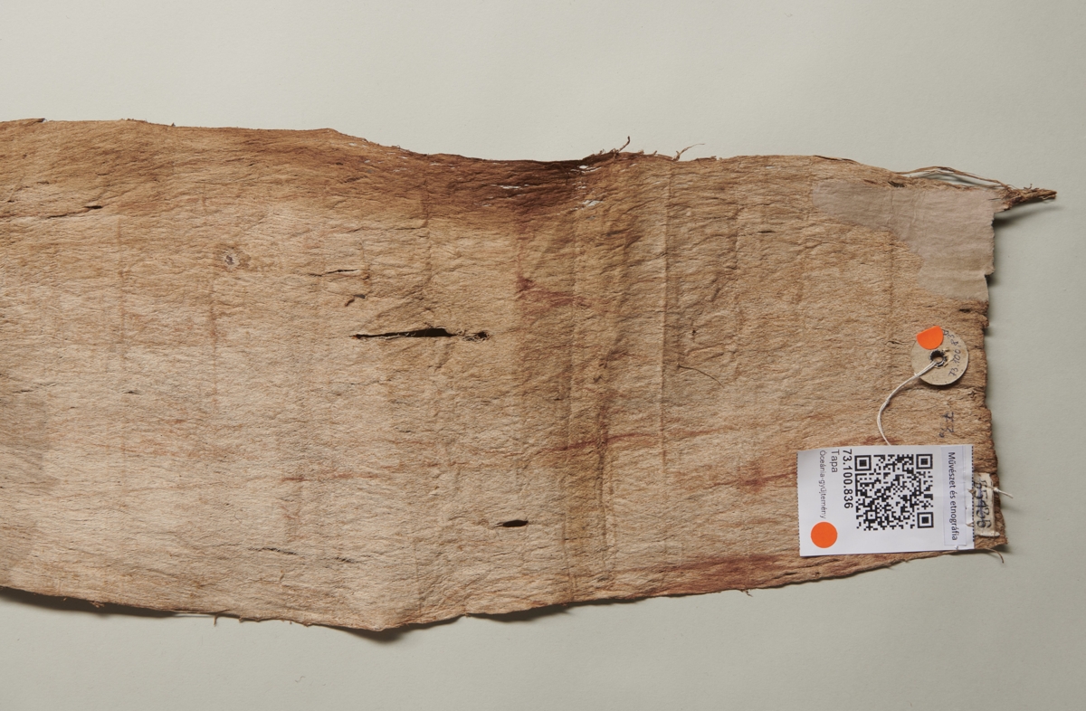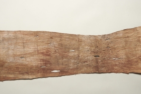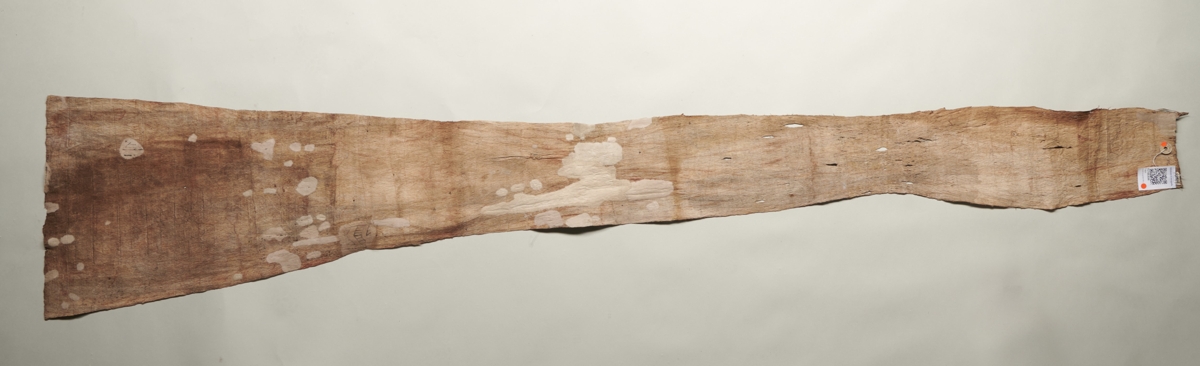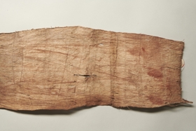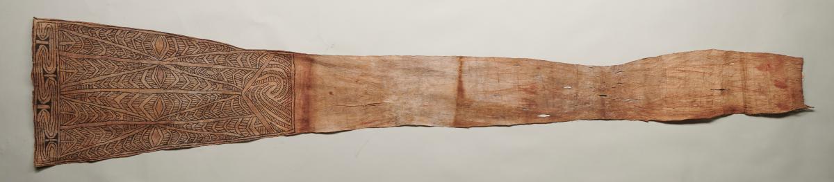 Hosszúkás, világos színű, fekete és vörös geometrikus mintákkal díszített kéregtextil.
