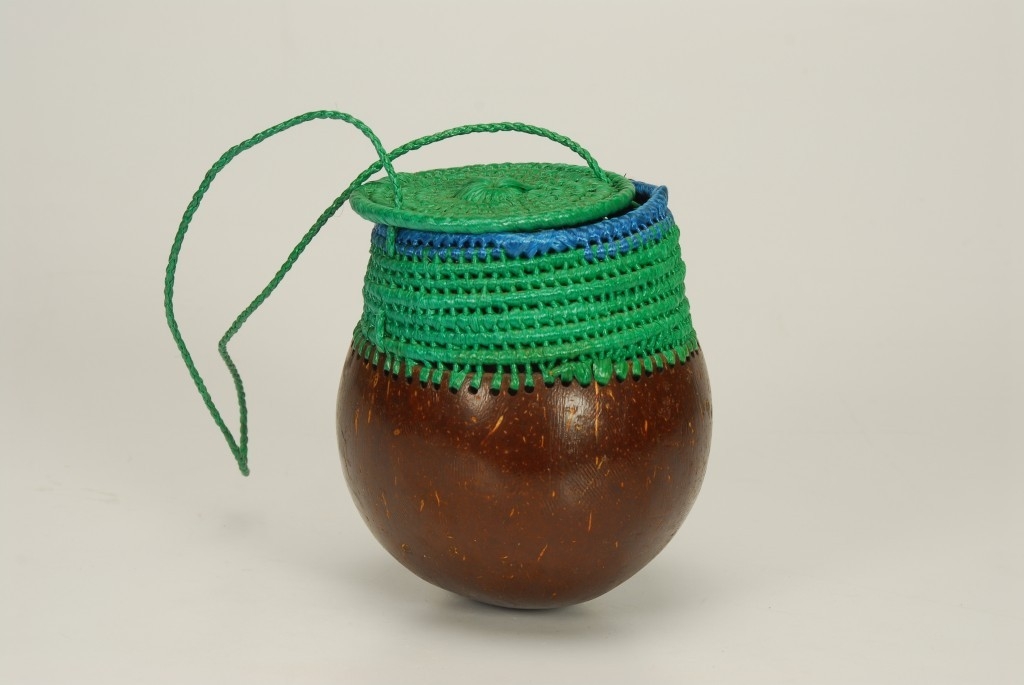 Nagy méretű sötétbarna kívül belül csiszolt kókuszhéj, amelyről a kókuszdió eredeti magasságának kb. egynegyede le van vágva. Felső pereme egy sorban sűrűn ki van lyukasztva, ezekbe van fűzve a feltehetően nylonzacskóból készült zöld színű madzag. A táska peremét további nyolc darab fapálcikából készült karika adja, amelyeket ezzel a műanyag madzaggal tekertek be, ill. egymáshoz is ezzel vannak rögzítve, kb. fél cm-es távolságokban. Tetejét egy ugyancsak fapálcikából készült, zöld nylonnal bevont és összeerősített spirál adja, kerek lapot képezve, amelyet zöldnylonból fonott, a táska fülét képező szál erősít a táska testéhez.