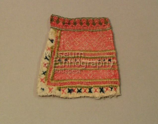 Megközelítőleg téglalap alakú piros alapszínű, zöld-nyersszínű csíkokkal díszített háziszőtes. Két szélén hímzett keresztek láthatók. Hátulja nyersszínű anyaggal bélelt.