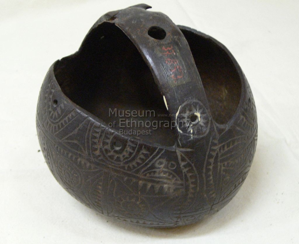 Száraz kókuszdióhéjból vájva. Színe sötétbarna. Gömb alakú, felsőrésze levágott. Peremének két átellenes pontját ív alakú fül köti össze egymással. Egész külső felületét mélyített vonalakból és körökből álló díszítések borítják.
