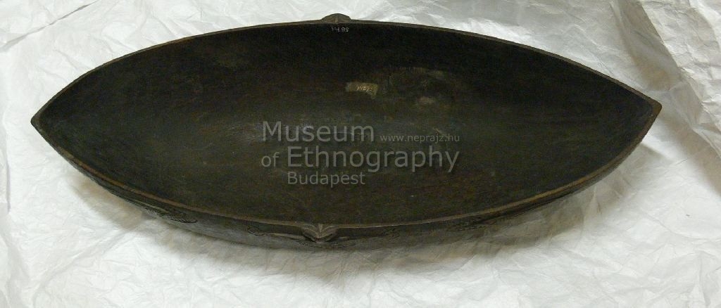 Ovális alakú, sötétbarna, keményfából készült talpatlan fatál. Két oldalán a pereménél domborúan faragottt Selam kígyó motívumokkal.