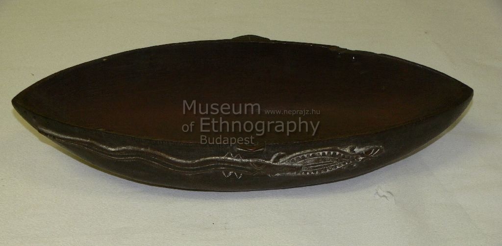 Ovális alakú, csúcsban összefutó végű, sötétbarna színű fatál, kétoldalt vörös, fekete és fehér színű kígyót és gyíkot ábrázoló díszítéssel.