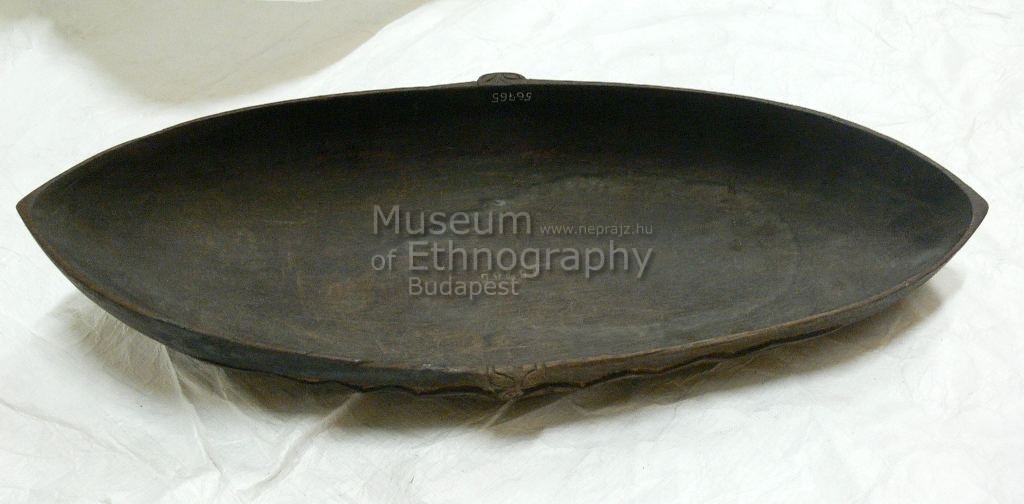 Ovális alakú, kicsúcsosodó végű, sötétbarna színű fatál. Mindkét oldalán középen arányosan elosztva kígyó motívum tami-stílus szerint.