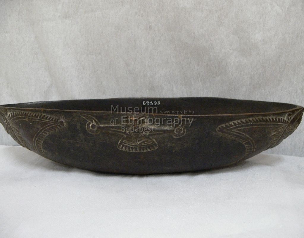 Ovális alakú, kicsúcsodó végű, sötétbarna színű, alján és oldalán tami-stílusú díszítésekkel ellátott fatál.