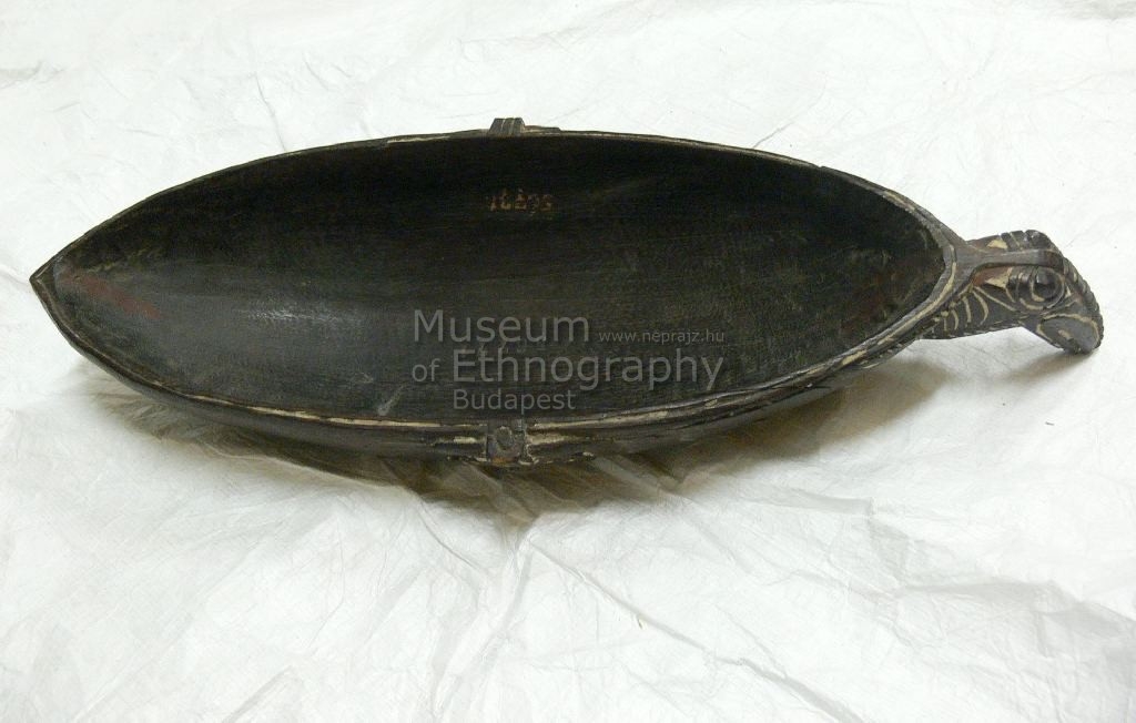 Ovális alakú, csúcsban összefutó végű, egyik oldalán madárfejet ábrázoló fogóval ellátott, pereme alatt kétoldalt jellegzetes tami-stílusú inkrusztált díszítésekkel.