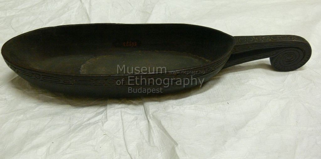 Ovális alakú, lekerekített végű, barnás-feketés fatál, pereme alatt körben végighúzódó sávos, helyenként inkrusztált díszítéssel. Egyik vége hosszú, geometrikus mintákkal ellátott fogantyú.