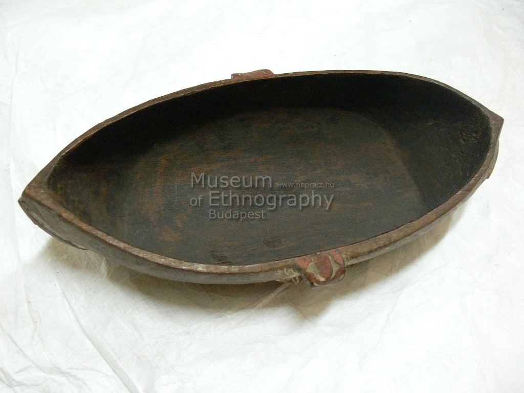 Ovális alakú, sötétbarna, kemény faanyagból készült talpatlan fatál. Két oldalán a pereménél domborúan faragott és pirossal festett Selam kígyó motívumokkal. Külső oldalának egyik hegyén nagyméretű emberarc, aminek fejdísze a tál alján a közepéig benyúlik. Ezek is faragottak és pirossal festettek.