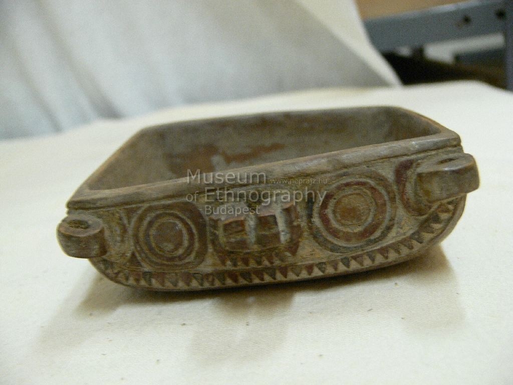 Kemény faanyagból készült, világos-barna színű, négyszögletes tálacska, két hosszabbik oldalán jabo-szerű faragványokkal, peremén végig inkrusztált faragással díszítve.