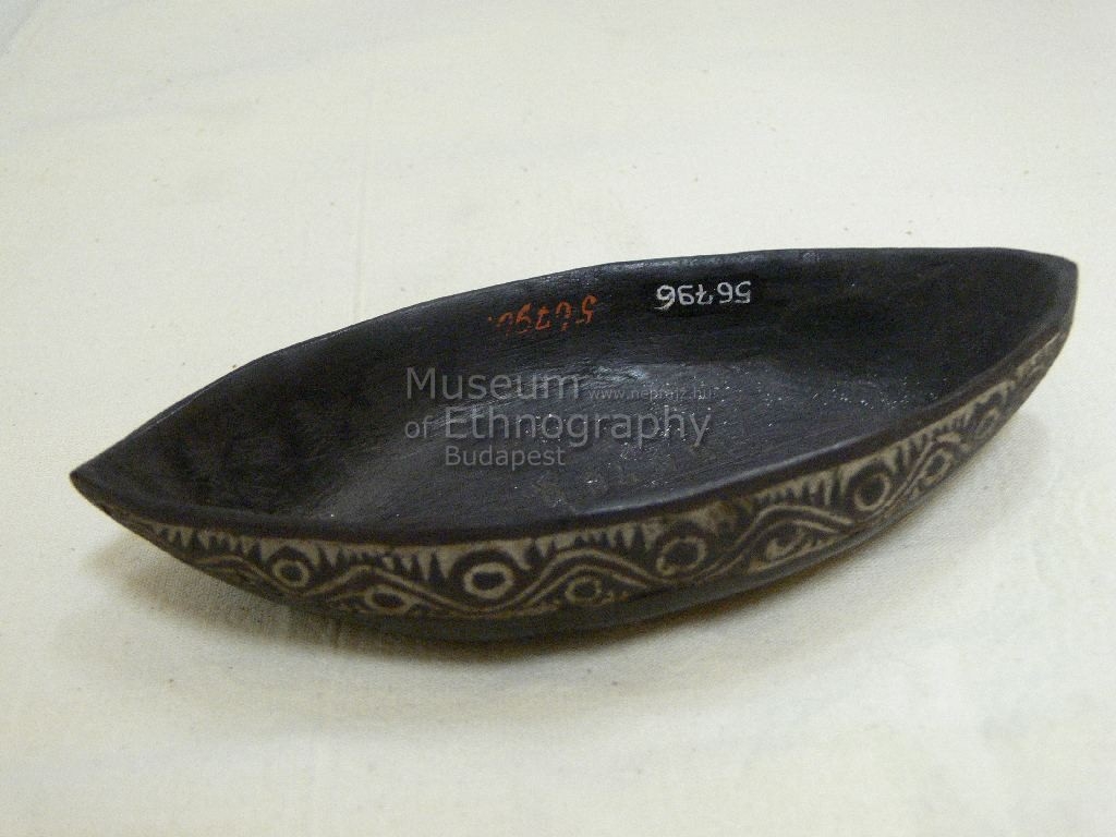 Ovális alakú, csúcsos végű, feketés színű fatál pereme alatt körbehúzódó sávos, geometrikus díszítéssel.