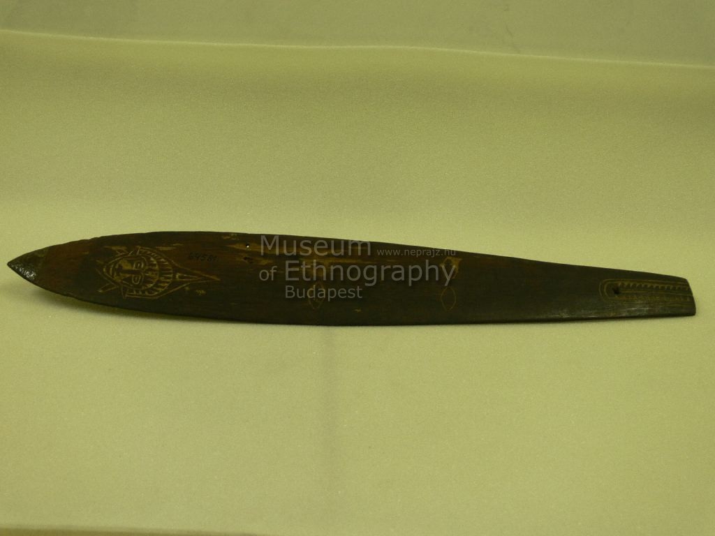 Kemény fából készült, sötétbarna színű, sáslevél alakú vékony lap. Egyik oldalán mélyített díszítések, amelyek közül az egyik emberarcot, a többi emberszemeket ábrázol. Egyik végén mindkét oldalon 6,2 és 6,5 cm hosszúságban mélyített vonalas és fűrészfogas díszítés van, egyik végén átfurt lyukkal.