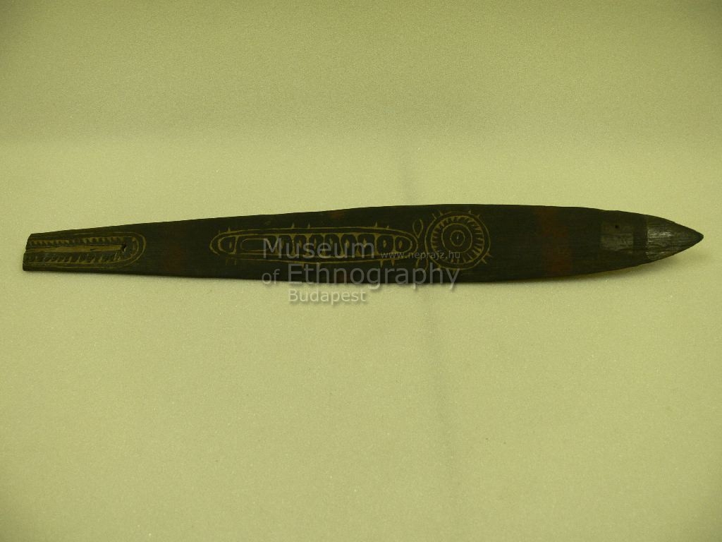 Kemény faanyagból készült, vörösesbarna színű, sáslevél alakú vékony lap. Mindkét oldala mélyített faragással díszített. Az egyik oldalon emberi arc, csillagalak és hullámvonalak, a másikon arcfestési motívum és hullámvonalak láthatók. Egyik végén mindkét oldalon 7 cm mélyített fűrészfogas díszítés, felső végén átlyukasztással. A díszítéssel fehérrel inkrusztáltak.