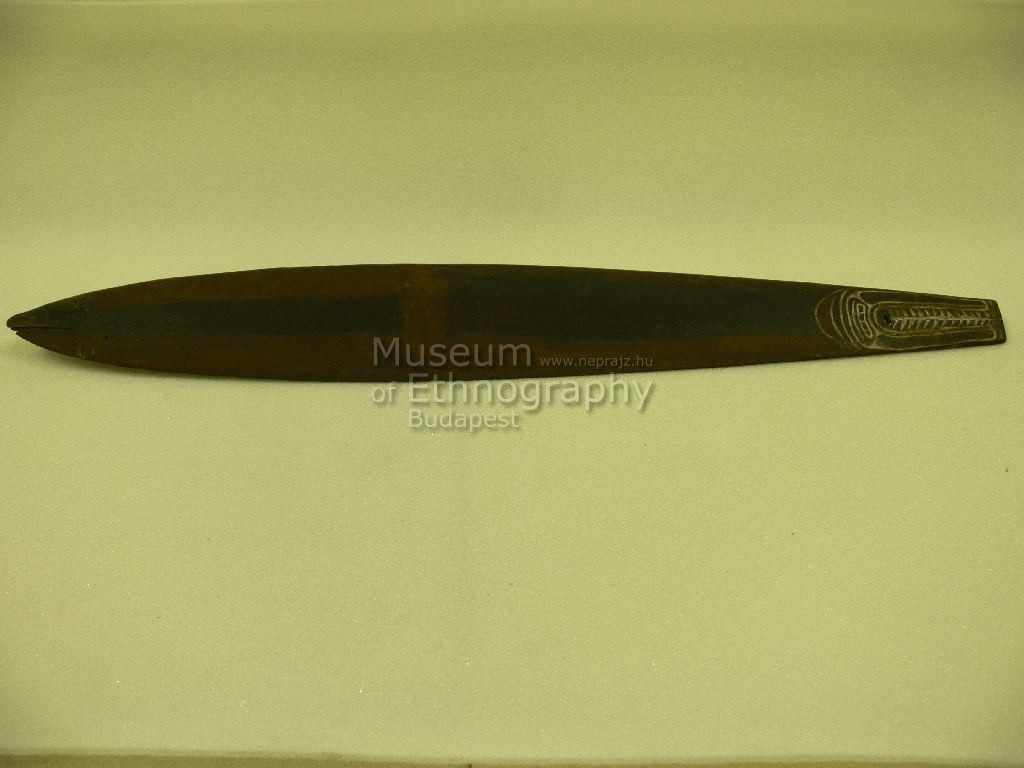 Keményfából készült, sötétbarna színű, sáslevél alakú vékony lap, egyik végén kétoldalas, 9,3 cm mélyített, közepén fűrészfogas fehérrel inkrusztált díszítéssel.
