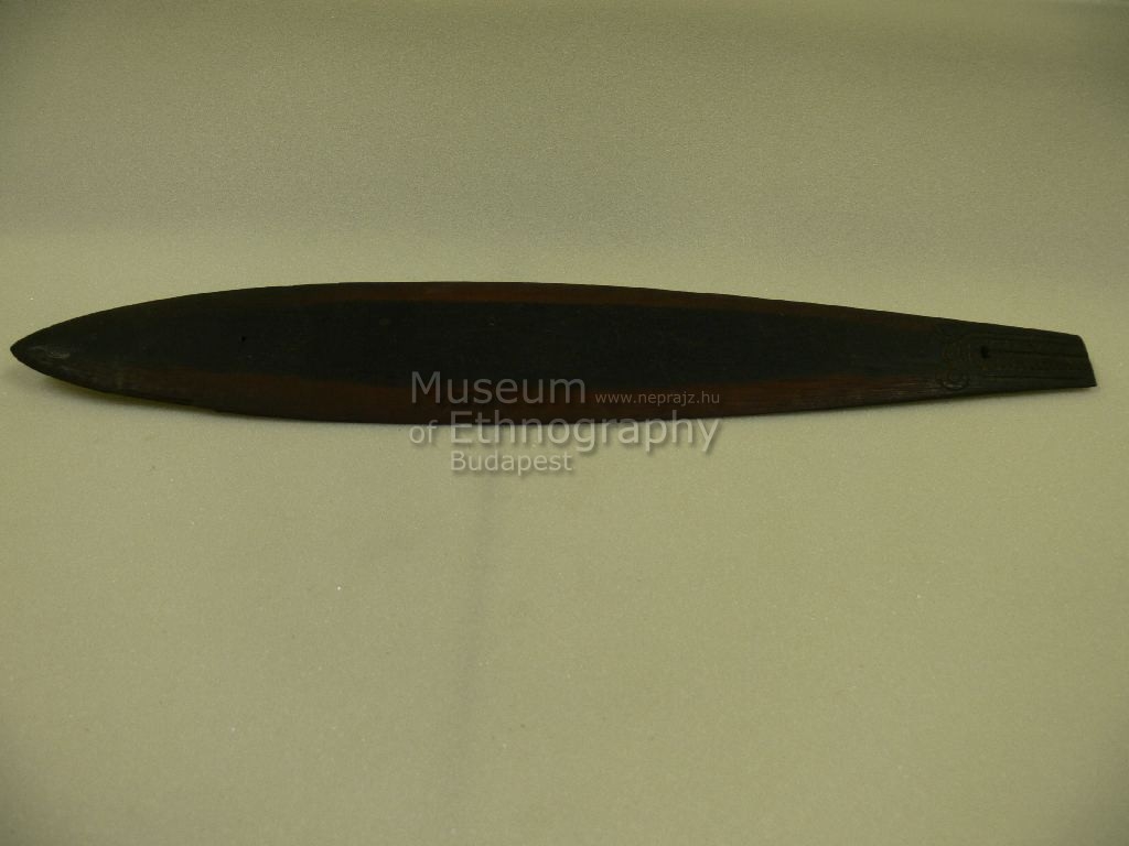 Keményfából faragott, vöröses és feketés színű, sáslevél alakú vékony lap. Teljesen díszítetlen, csak egyik végén van mindkét oldalon mélyített, fűrészfogas és jabos motívumokból álló díszítés. Ugyanitt át van lyukasztva.