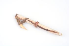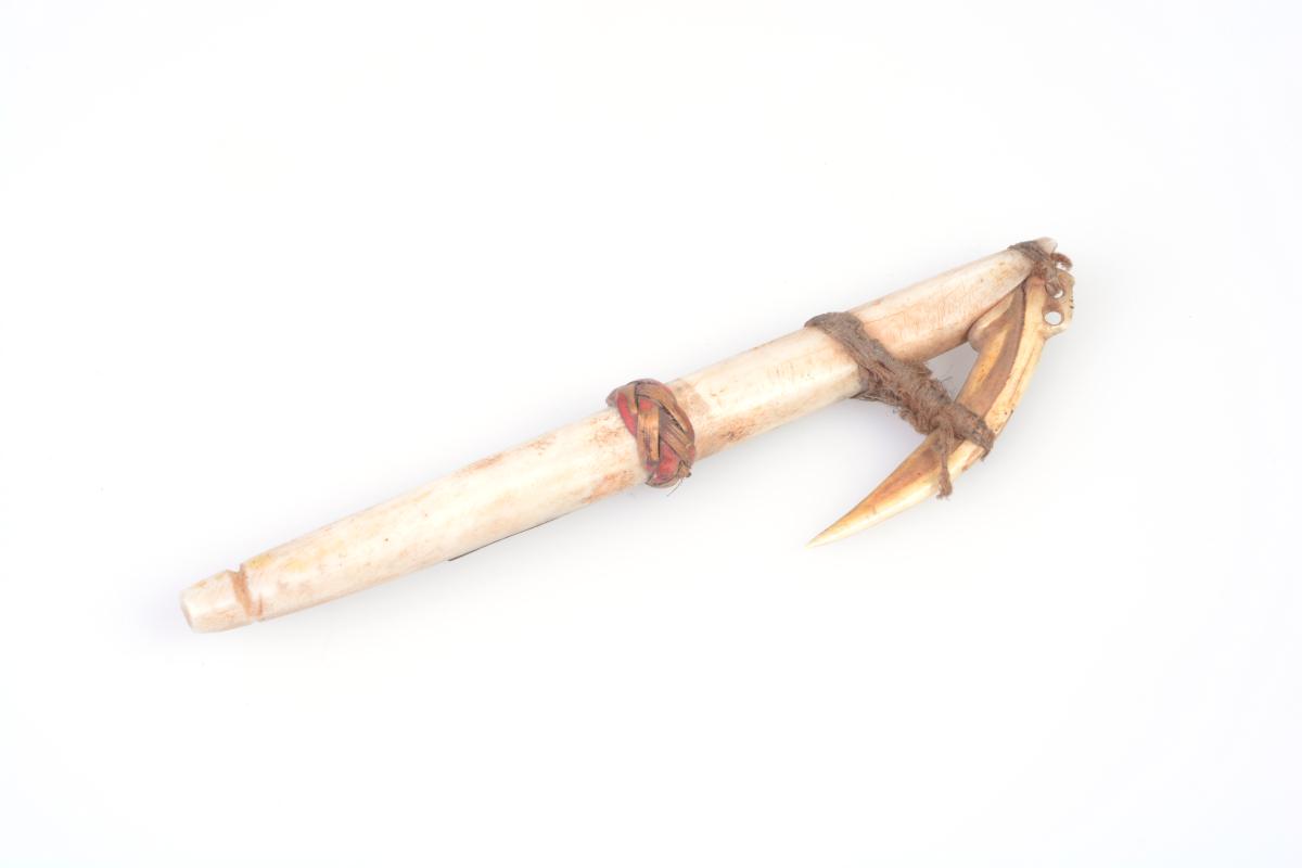 Kétrészes: egyik része hengeres, fehéres színű, kagylóból készített, egy helyen körbefutó barázdával ellátott; másik része lapos, hegyes, sárgás-fehéres színű, csontból készített. A csontrészen két lyuk van. A két részt két helyen rostkötelék erősíti össze; ezek egyike a két lyuk egyikén van keresztülhúzva. A hengeres réászen fonott sásgyűrű van.