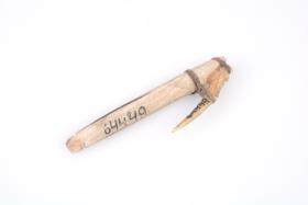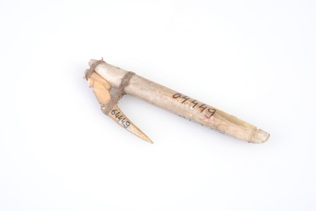 Kétrészes: egyik része hengeres, piszkos-fehéres színű, kagylóból készült, egy helyen körbefutó barázdával ellátott; másik része lapos, hegyes, sárgás színű, csontból készített, egy helyen átfurt s két helyen bevágással ellátott.A két részt rostkötelék erősíti egymáshoz.
