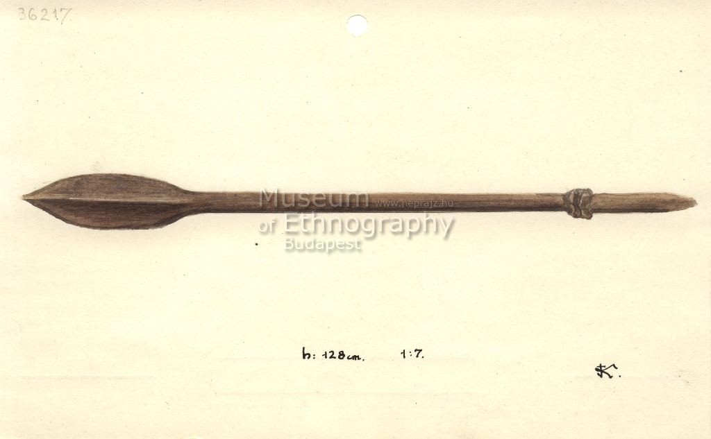 Barna keményfából készült, ívelt profilú. A markolati vége homorú felső peremű rész. Ennek keskenyebb oldalán egy egyszerűen faragott, vésett emberi arc látható. A markolati rész lekerekített végű hegyben végződik, amelynek oldalélei enyhén domborúak. A nyél enyhén szélesedő és vastagodó. A másik végén egy konkáv ívelt nyakú 'lapát' van. A lapát oldalélei enyhén összetartóak, a hosszanti középvonalán mindkét oldalon egy keskeny, alacsony gerinc húzódik. PA