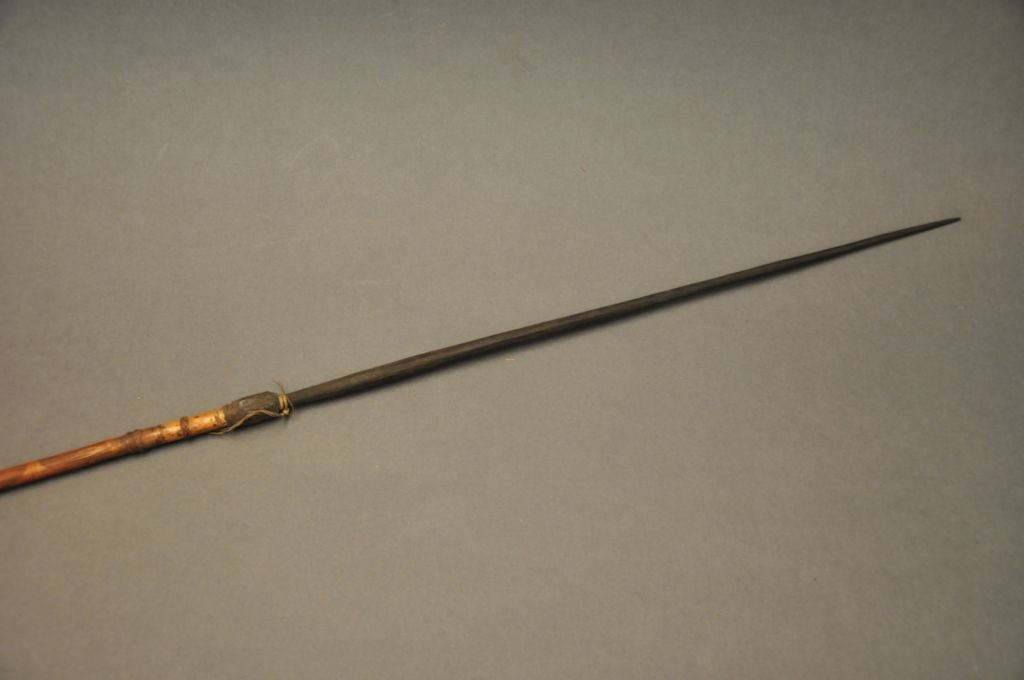 Kétrészes: nyele feketés színű, hengeres nád, hegye feketés színű hengeres keményfa. A két rész illeszkedésénél feketés színű aszfaltszerű anyaggal bevont fonadék és két barnás színű, fonott háncsgyűrű van. Díszítetlen.