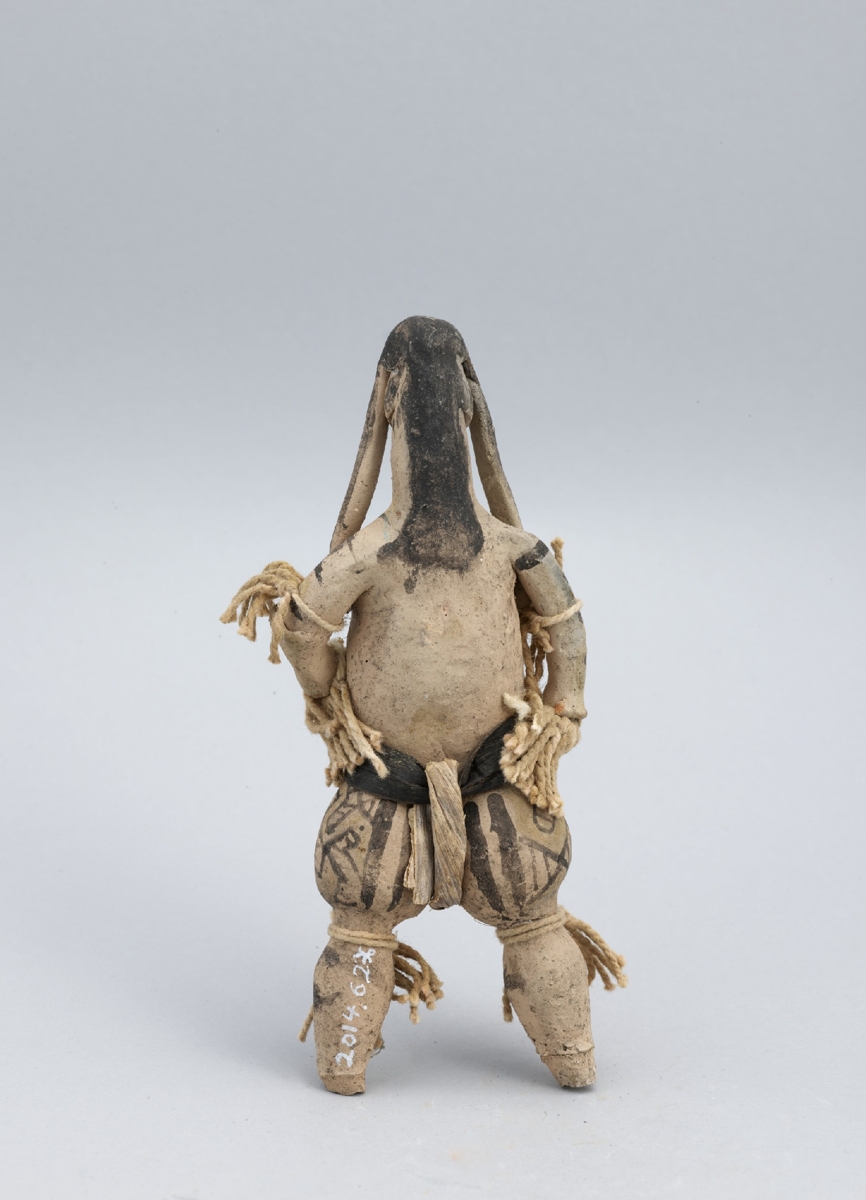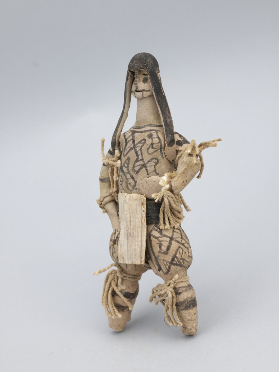 Agyagból kézzel formált álló nőalak. Combjai vaskosak, térdnél elvékonyodik a lába. Bal kezét a hasán, a jobbat a combján nyugtatja. Mellei kicsik, nyaka hosszú, arcvonásait jelezték. Haja három ágban a válláig ér. Derekán feketére festett pálmalevél öv és natúr színű pálmalevél ágyékkötő. Testét szürkésfehér alapon fekete geometrikus festés díszíti. Karján, csuklóján és térdén fehér pamutfonalból kötözött rojtokat visel.