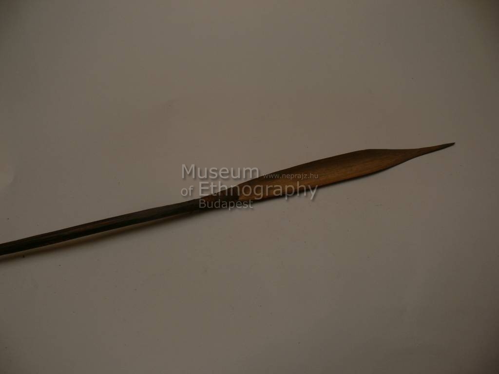 Háromrészes nyílvessző. A nádból metszett szárba növényi rostfonattal rögzítették a kerek keresztmetszetű, keményfából faragott középrészt, ahhoz pedig ugyanolyan technikával a levélalakú, bambuszból készült hegyet.