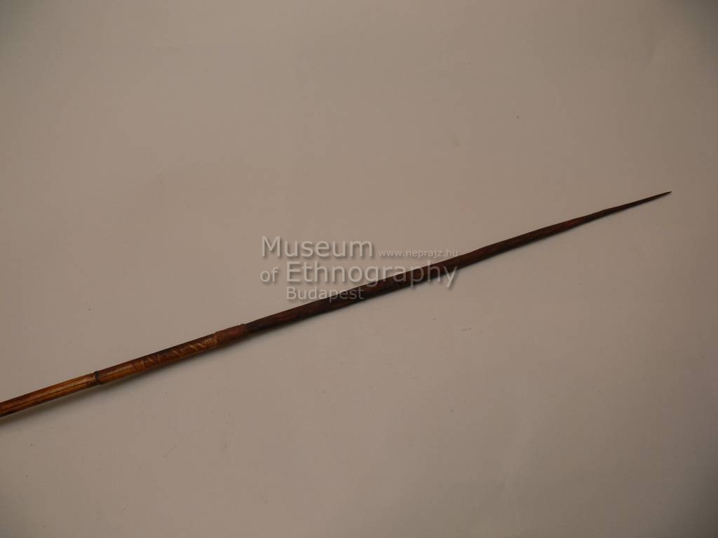 Kétrészes nyílvessző. A nádból készült szárba növényi rosttal rögzítették a keményfából faragott hengeres keresztmetszetű hegyet. A szárba hosszanti csíkokat, egy szakaszon pedig geometrikus motívumokat égettek.