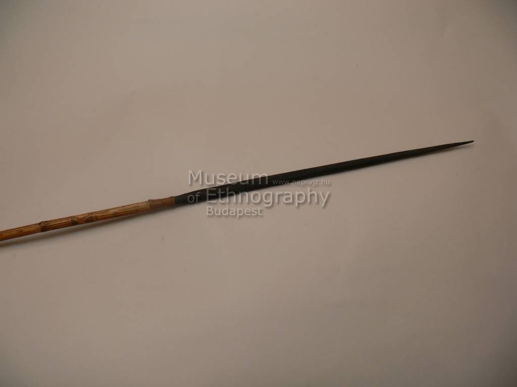 Kétrészes nyílvessző. A nádból faragott szárba növényi rostfonattal rögzítették a ovális keresztmetszetű hegyet. A szárba hosszanti csíkokat, egy szakaszon pedig geometrikus mintákat égettek.
