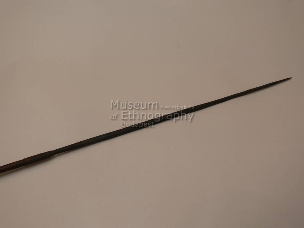 Kétrészes nyílvessző. A nádból metszett szárba növényi rosttal rögzítették a négyzetes keresztmetszetű keményfa hegyet.