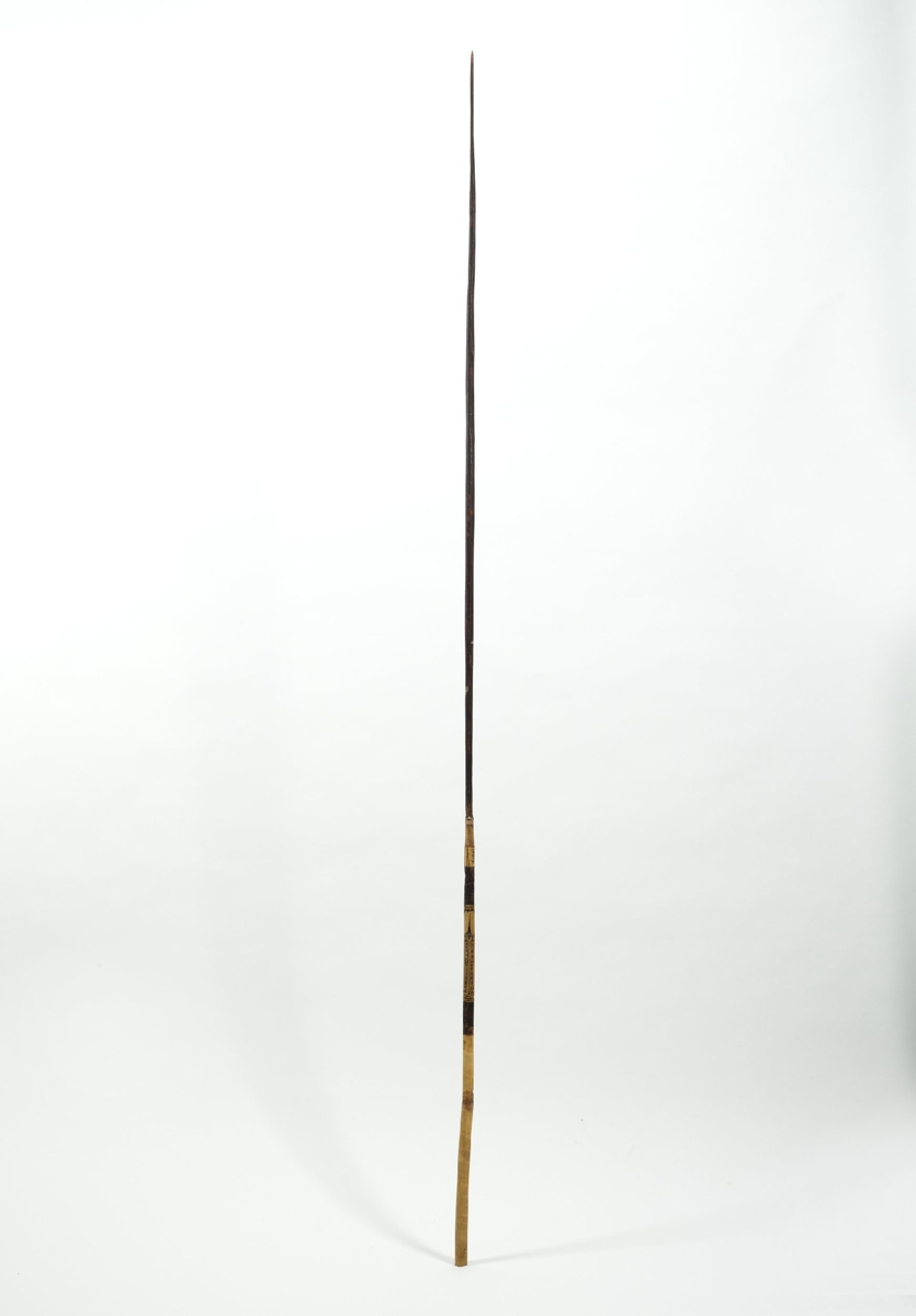 Kétrészes nyílvessző. A nádból metszett szárba növényi rosttal rögzítették a hengeres keresztmetszetű keményfa hegyet. A szár felső harmadába geometrikus mintát égettek.