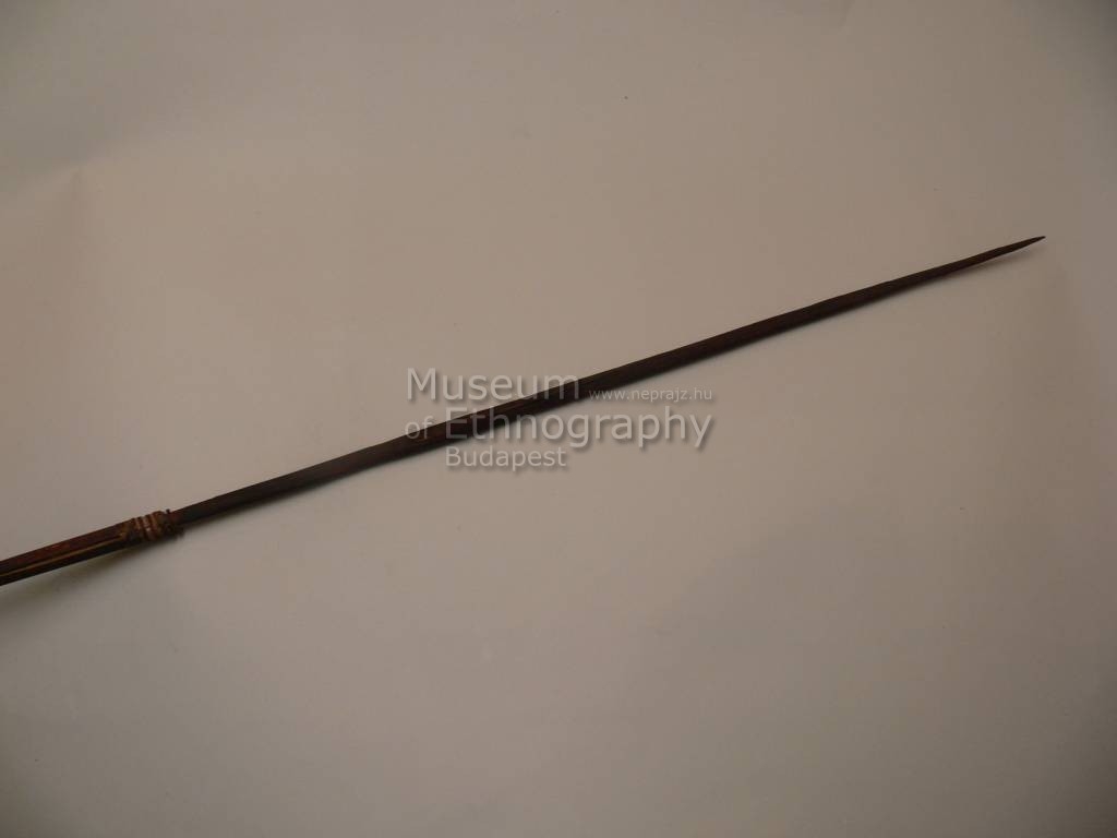 Kétrészes nyílvessző. A nádból készült szárba növényi rosttal rögzítették a hengeres keresztmetszetű keményfa hegyet.