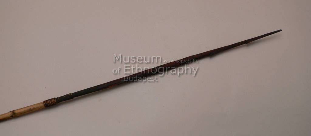 Világos színű nádszál egyik végén növényi rosttal felerősített vöröses színű keményfából faragott szakás hegy, amelyet mélyített vonalak díszítenek.