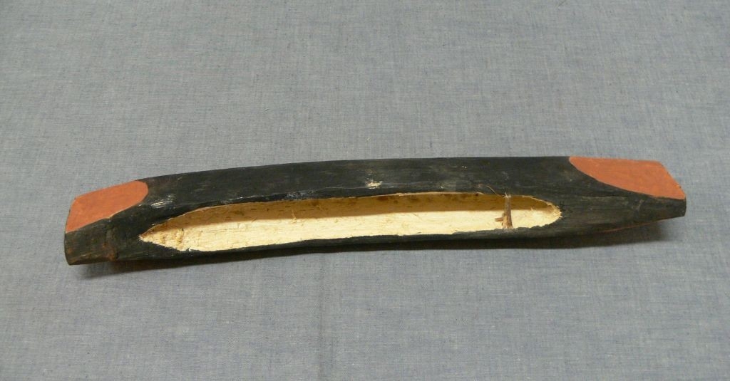 Egy darab puhafából faragott gyermekjáték kenu. Belseje natúr, egy pálcával osztott, külső része fekete, két vége vörösre festett.
