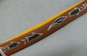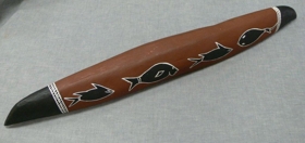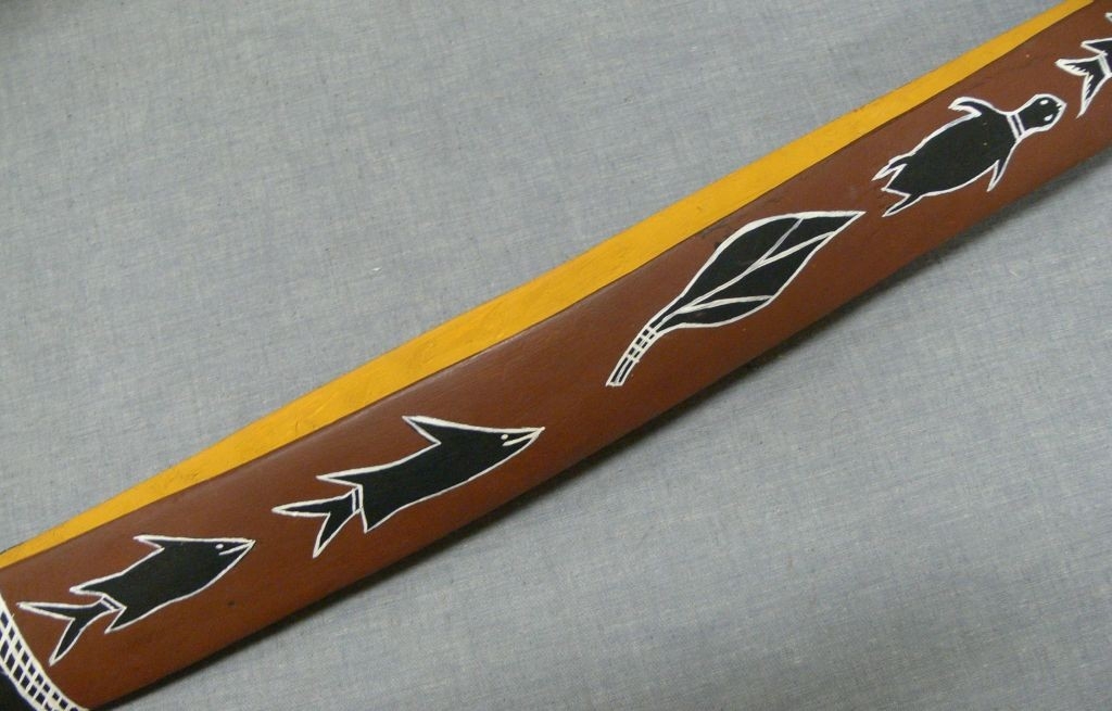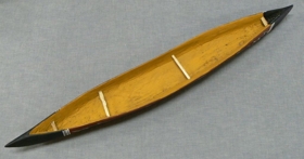 Puhafából faragott gyermekjáték kenu. Belseje sárga okkerre festve, külső oldalán vörös alapon fekete-fehér halak díszítik. A kenu vége feketére festett, fehér díszítéssel.
