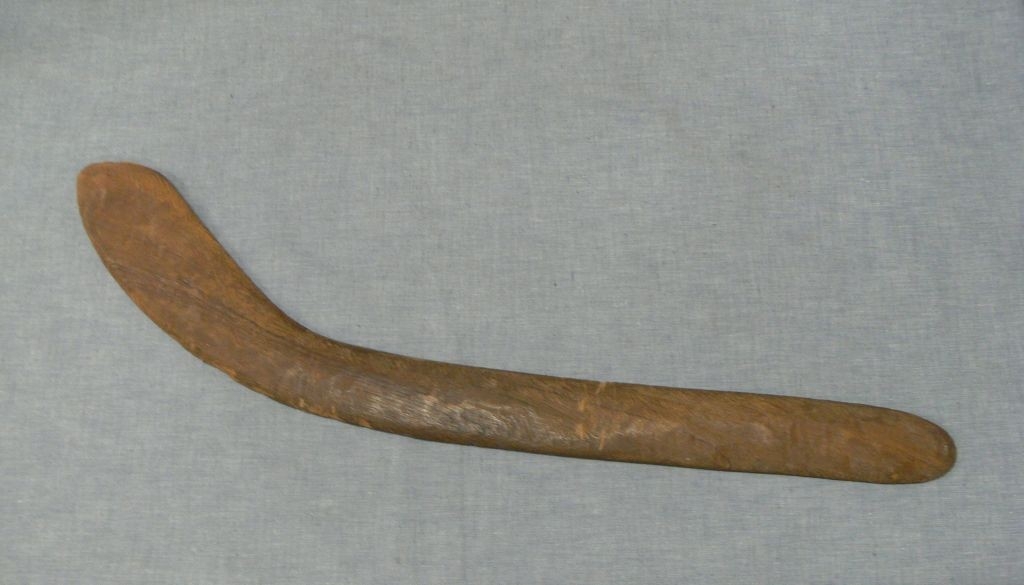 Keményfából készült, festetlen, íves bumeráng. A Numburindi emberek által használatos vadászati eszköz.