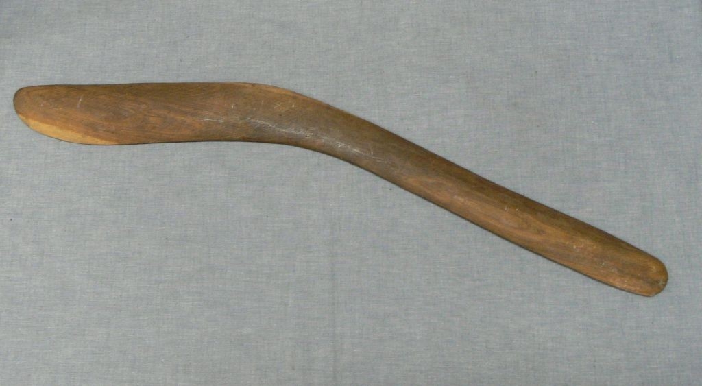 Keményfából készült, festetlen, íves bumeráng. A Numburindi emberek által használatos vadászati eszköz.