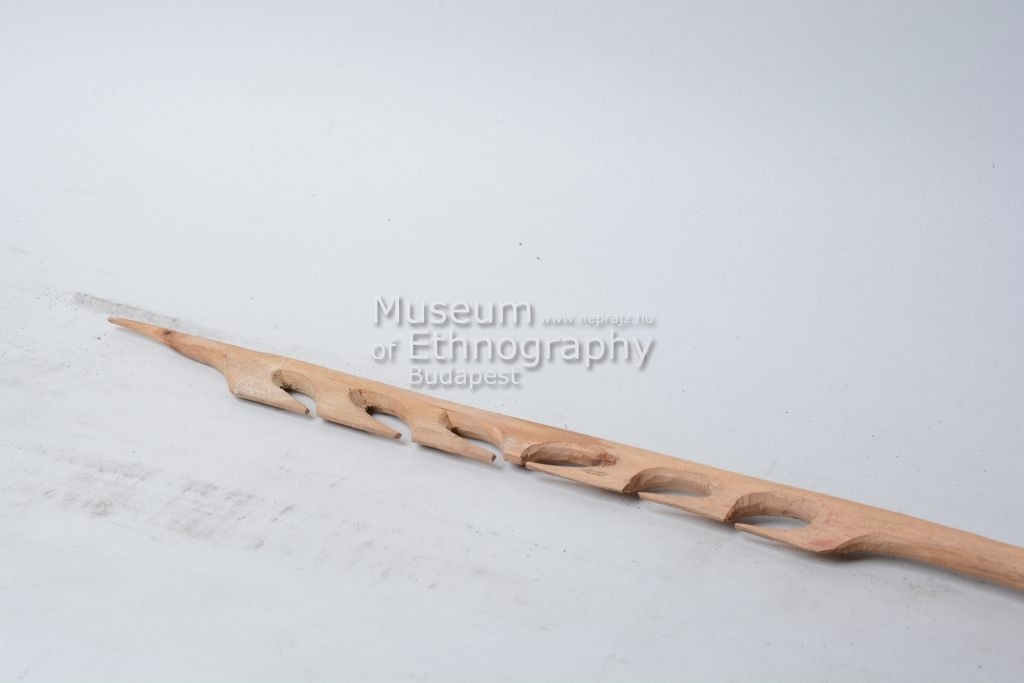 Fogazott keményfa lándzsa. Az egy darab fából kifaragott lándzsa végén fogazat van, melyen 3-3 fog egymással szemben áll. A zsákmány belső részének eltávolítására használatos lándzsa.