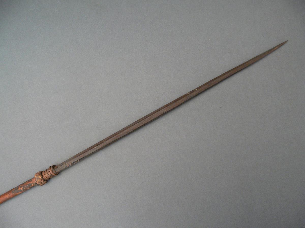 Kétrészes: nyele barna színű, hengeres nád, hegye feketés színű, szögletes, négyélű keményfa. A két rész illeszkedésénél a nyélre háncsszalag van tekerve, ez alatt sárgás színű orchideaháncsból fonott gyűrű van. A hegy alsó részén feketés színű, aszfaltszerű anyagbevonat nyomai látszanak. Díszítetlen. Nyelének alsó vége repedezett.