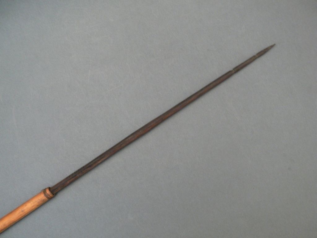 A bambusznád szárba keményfából négyzetes átmérőjűre faragott, rovátkákkal ellátott hegyet illesztettek.